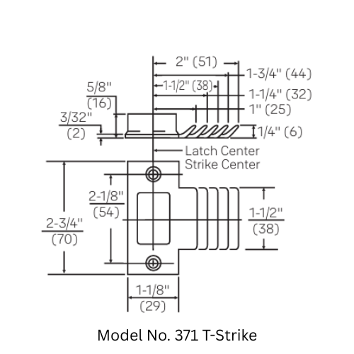 - 371 T-Strike (Optional): 2-3/4″ x 1-1/8″ x 1-1/4″ lip to center; standard for knob functions. Curved lips from 1″ to 2″ are available by special order and include a wrought strike box.