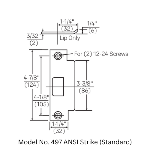 - 497 ANSI Strike (Standard): For frames prepared to ANSI/BHMA A156.115. Measures 4-7/8″ x 1-1/4″ x 1-1/4″ lip to center, with an optional 202 strike box.