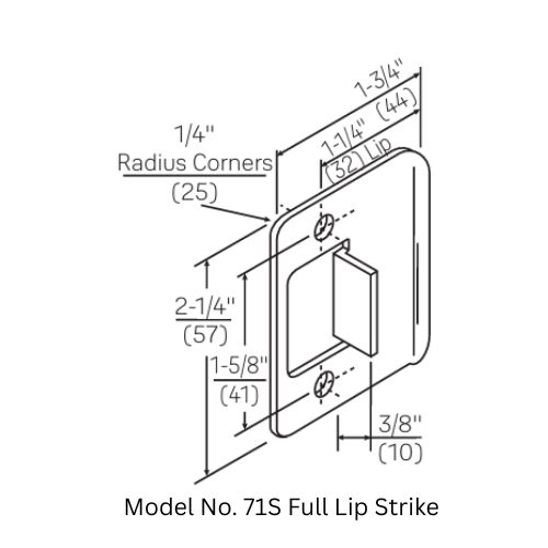 - 71S 1/4″ Radius Full Lip Strike (Optional): Same dimensions and function as the 70S, but with radius corners for easier power-tool mortising; includes anti-rattle tab.