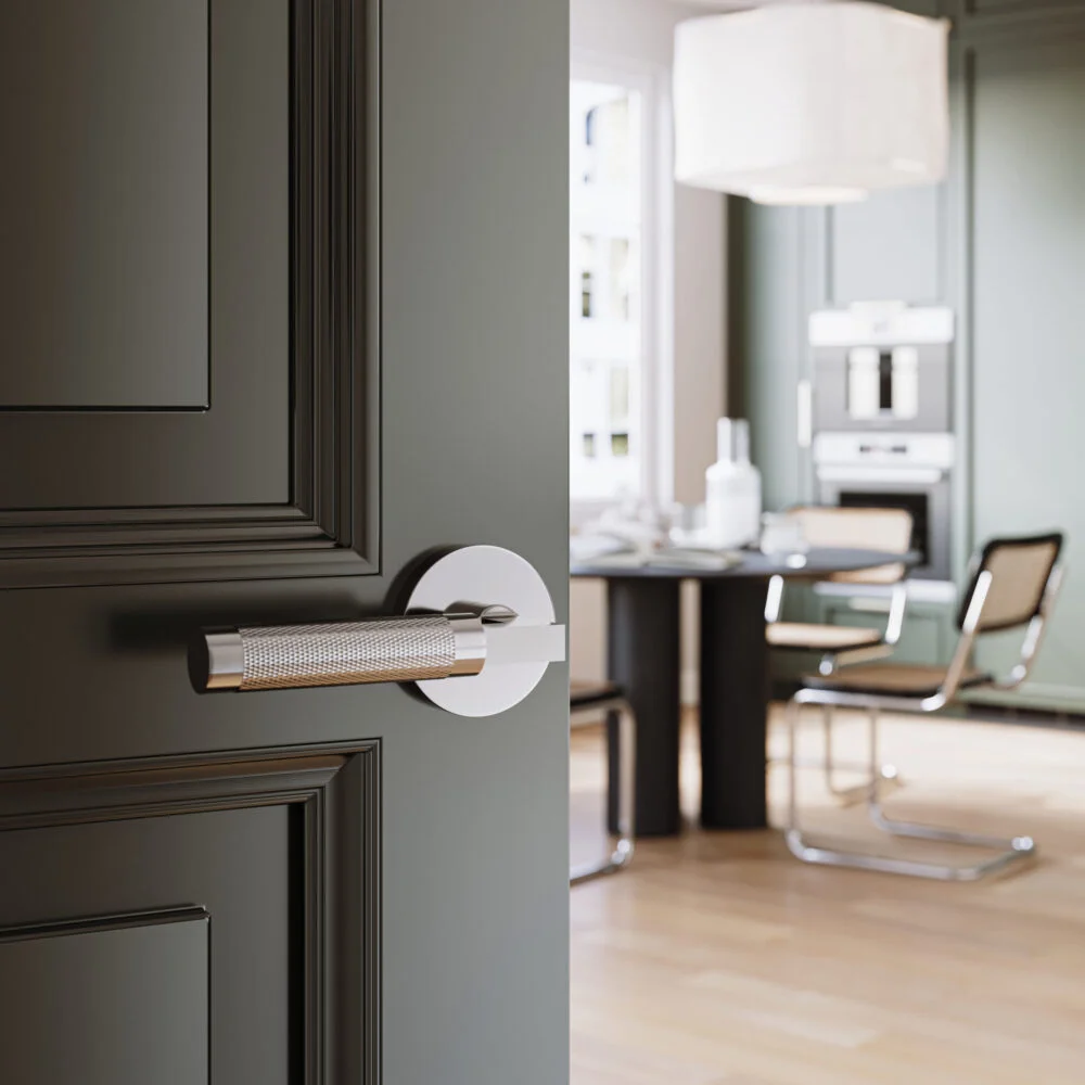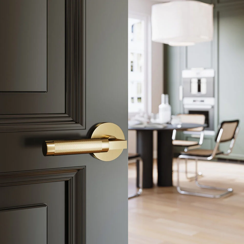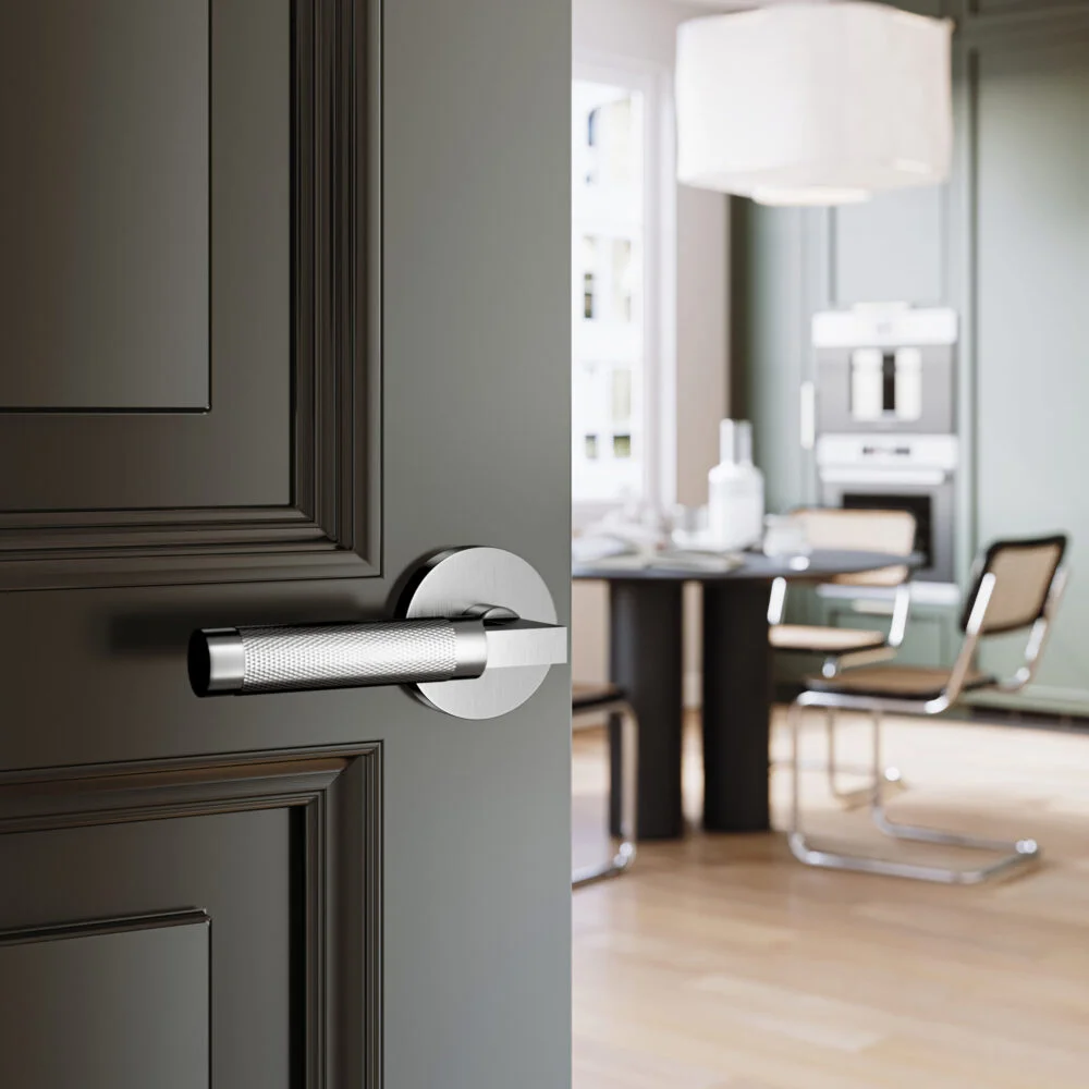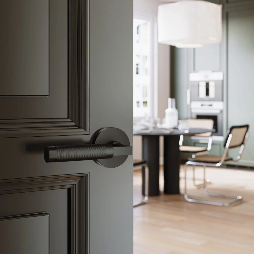A knurled, sophisticated lever that adds elegance and texture to interior doors. Ideal for bedrooms, bathrooms, and closets with Privacy, Passage, or Dummy functions.