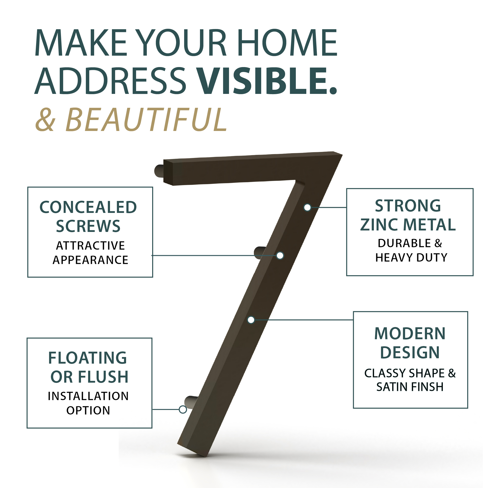 Crafted from heavy-duty zinc metal, this number is designed to withstand outdoor conditions while maintaining its sleek appearance. In addition, concealed screws create a smooth and modern finish, keeping the design clean and attractive. Each set also includes 3 anchors, 3 dowels, and 3 half-inch spacers, so installation is quick and secure. As a result, it combines durability, functionality, and modern style in one easy-to-install piece.
