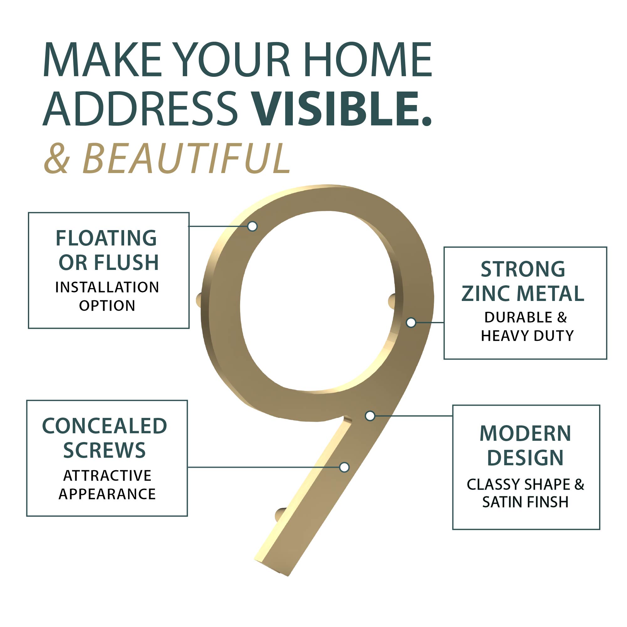 Crafted from heavy-duty zinc metal, this number is built to withstand outdoor conditions while maintaining its sleek appearance. Additionally, concealed screws create a smooth, modern finish, keeping the design polished and attractive. Each set also includes 3 anchors, 3 dowels, and 3 half-inch spacers, making installation quick, secure, and hassle-free. As a result, it combines durability, functionality, and contemporary style in one easy-to-install piece.