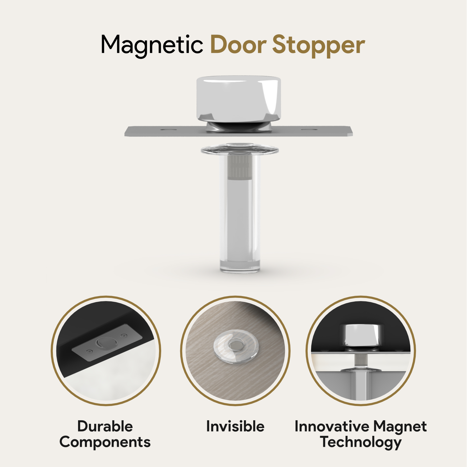 The Mega Handles Invisible Magnet Doorstop is a sleek, floor-mounted magnetic door catch that keeps doors securely in place while protecting walls from damage. This invisible doorstop uses powerful concealed magnets to hold doors reliably, eliminating bulky hardware, tripping hazards, and visual clutter.