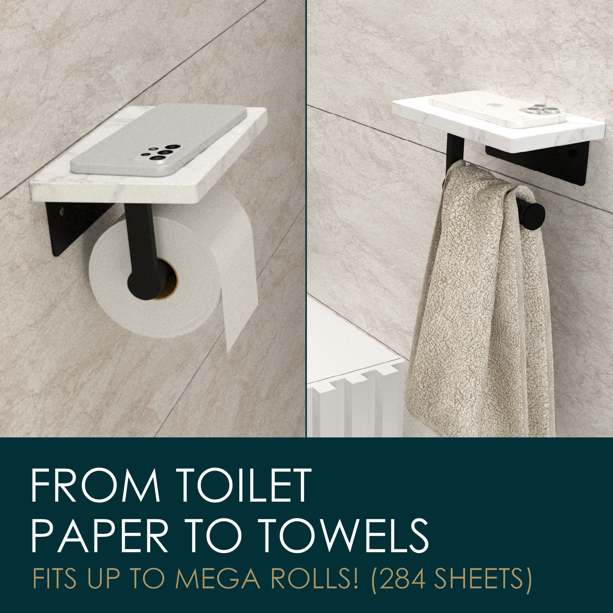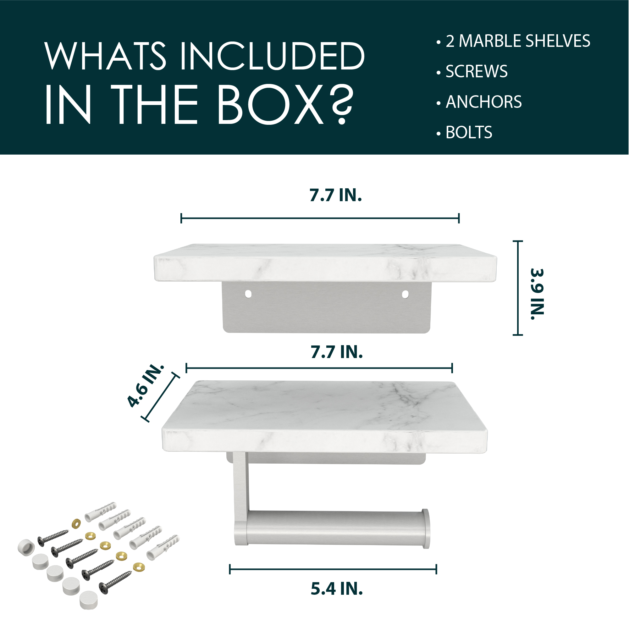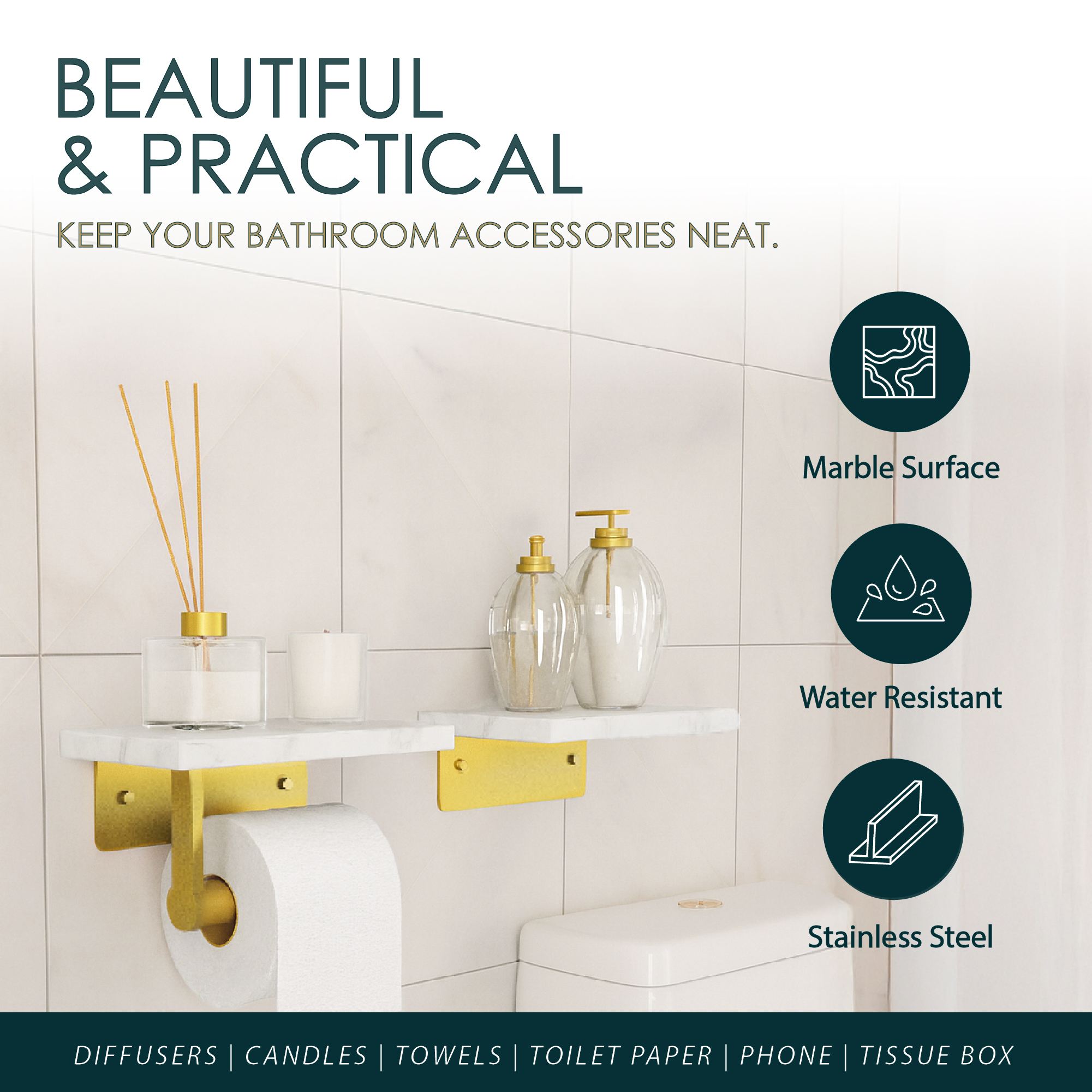 Crafted with a solid stainless steel base and a premium marble-style surface, this holder offers both durability and refined design. Moreover, the water-resistant finish ensures long-lasting performance, even in humid bathroom environments. Included with the holder are 2 marble shelves, screws, anchors, and bolts, so installation is simple and complete. As a result, it adds both function and a touch of luxury to your daily routine.