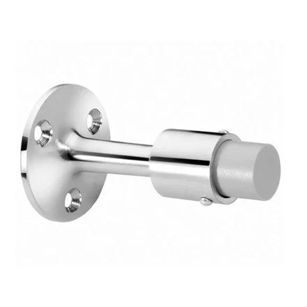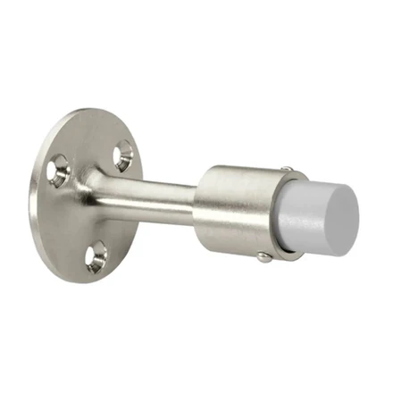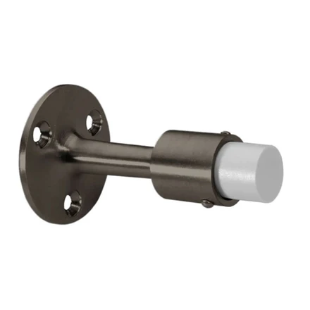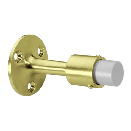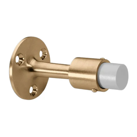 This wall-mounted door stop features a cast brass base and rubber bumper that cushions impact to protect doors and walls. Its three-fastener design ensures a secure and stable installation for long-lasting performance.